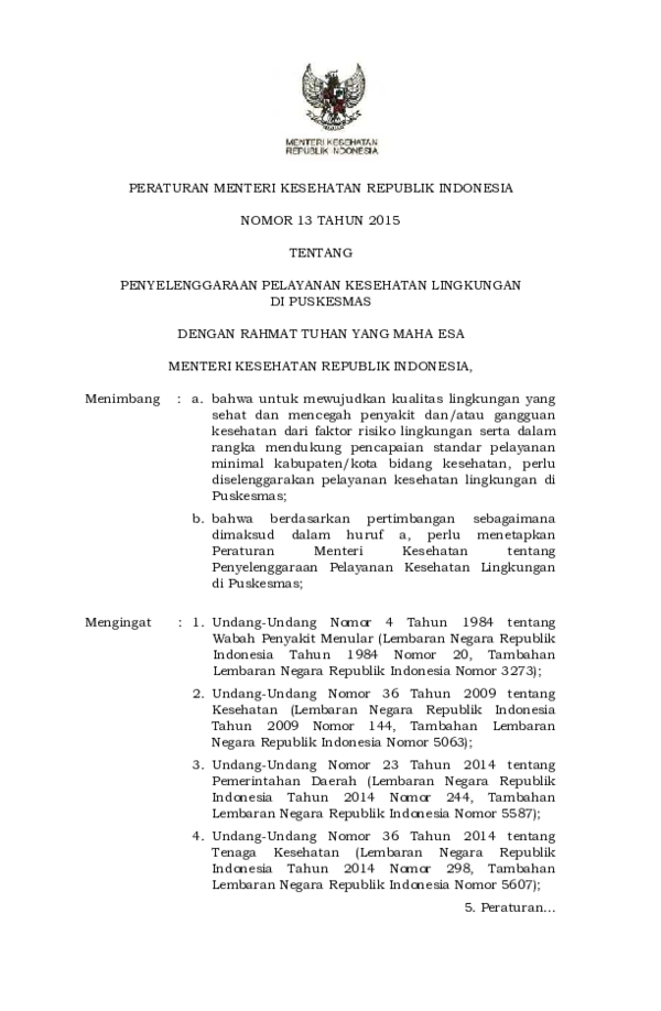 Permenkes No 13 Tahun 2015 Ttg Pelayanan Kesling Di Puskesmas